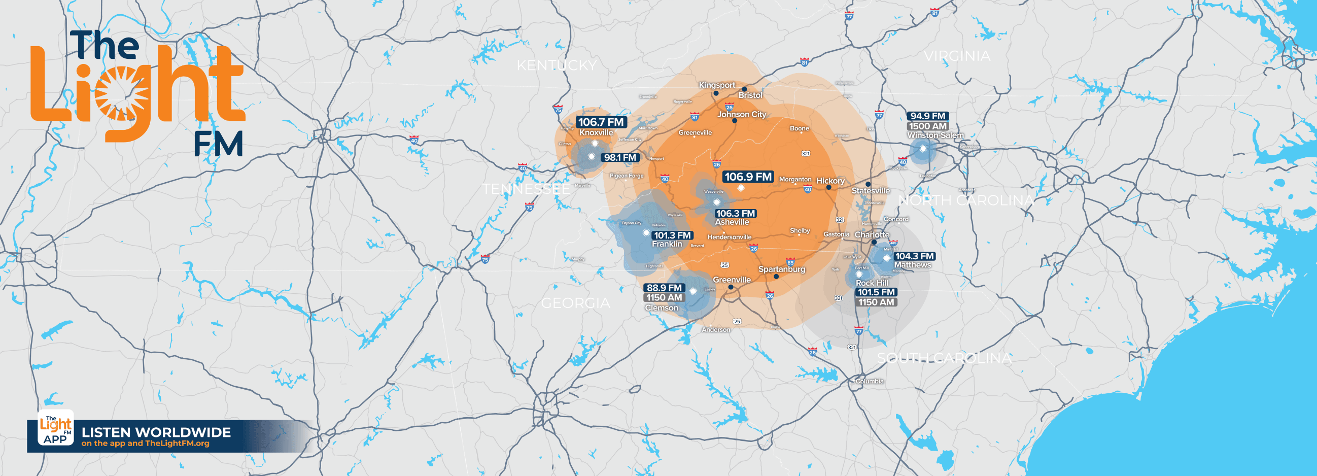 The Light FM has frequencies in three states, reaching parts of seven states in the US. You can listen anywhere online or through The Light FM App.